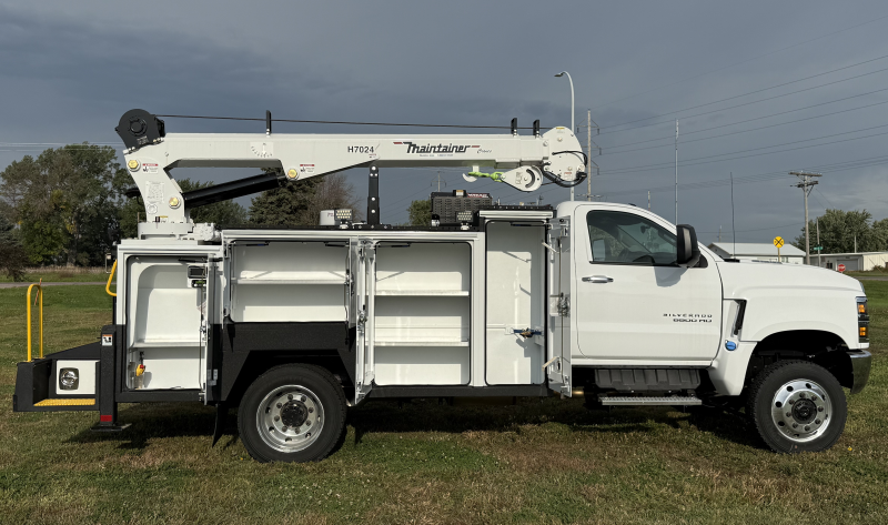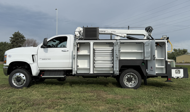 Signature Series 1- 11’ crane body equipped with H7024 crane, pressurized storage system, master compartment locking system, H40 rotary screw air compressor, DuaLock™ drawers, LED interior and exterior lighting packages, 26" steel workbench bumper and much more! Mounted on a 2023 Chevy 6500, Reg-cab, 4x4, 23K-GVWR, 6.6L Diesel, auto-trans, white-color, chassis.